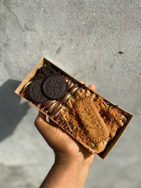 Box crêpes dessert personnalisées, garnies de pâte à tartiner, biscuits Oreo, Lotus, Milka ou Kinder. Un choix gourmand à partager ou déguster seul, idéal pour une pause sucrée ou un dessert original.