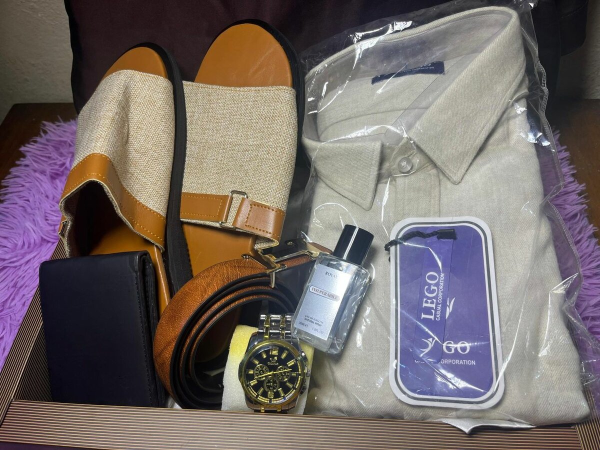 Coffret cadeau homme composé : -Une élégante chemise -Une magnifique montre -Une paire de chaussures -Un parfum -Une ceinture -Un portefeuille