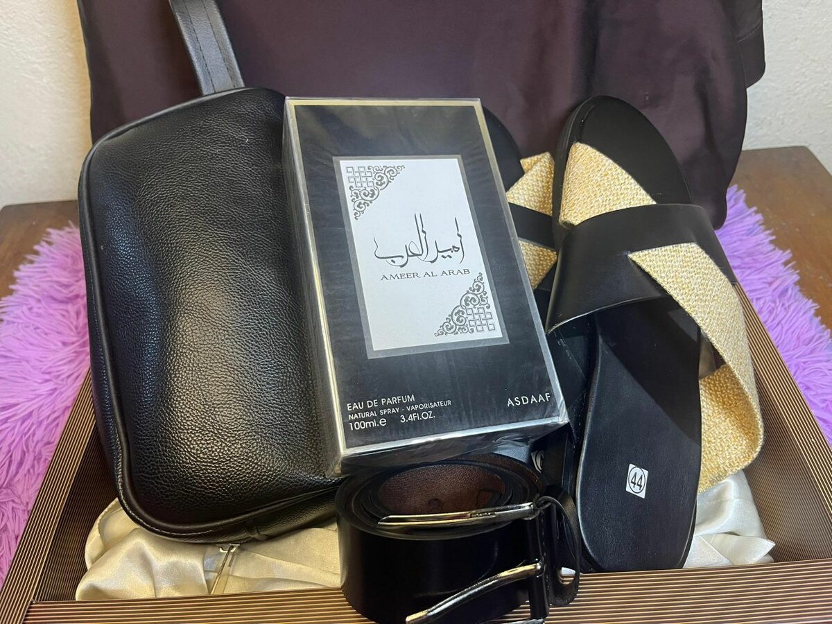 Coffret cadeau homme composé : -Une paire de chaussures -Une pochette -Un parfum
