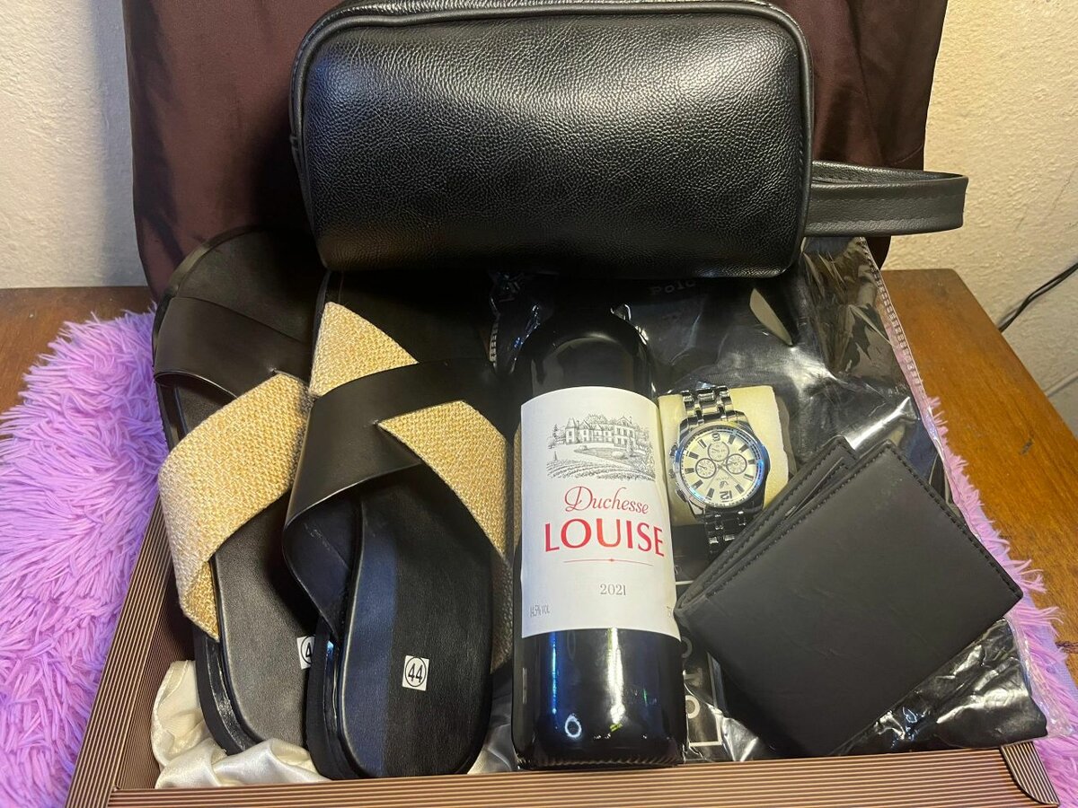 Coffret cadeau homme composé : -Une chemise -Une paire de chaussures -Un pochette -Une bouteille de vin -Une montre -Une portefeuille