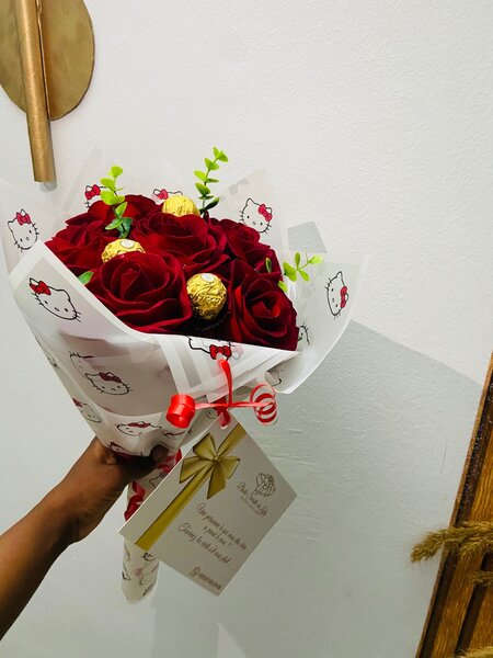Un bouquet de 5 roses naturelles accompagné de la boîte Chocolat Premium Pyramide Rocher , une carte St Valentin