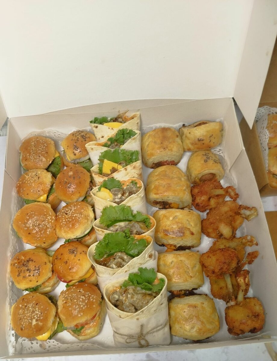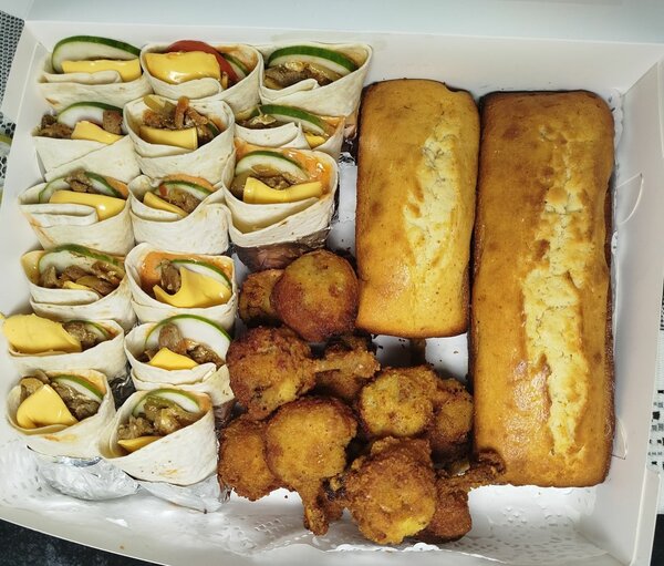 10 mini burger, 7 wraps 7 feuilleté à la viande 6 ailerons