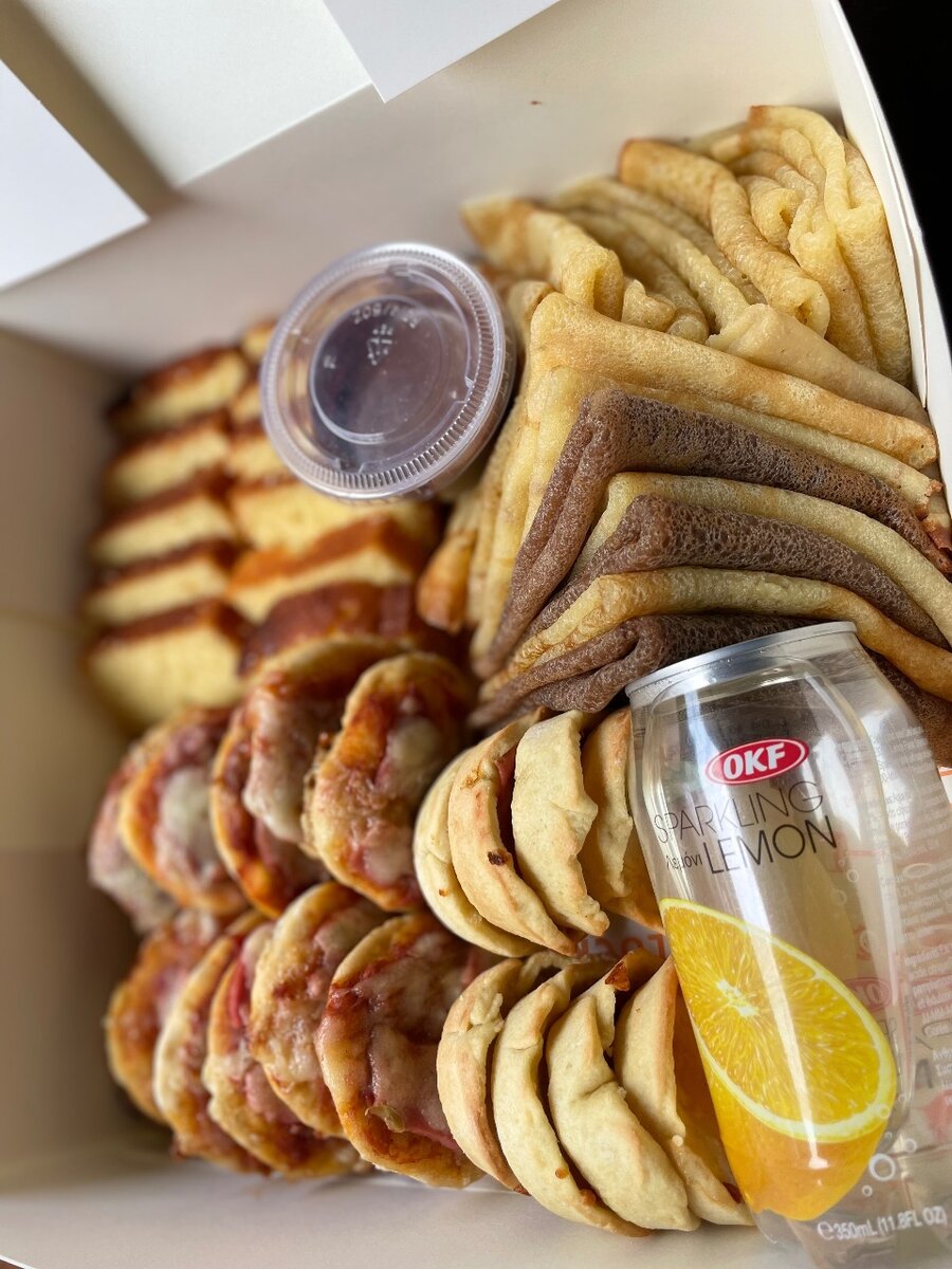 15 crêpes(choco,nature) , 12 mini pizza, 10 mini quiches, 10 barres de cakes, une canette.