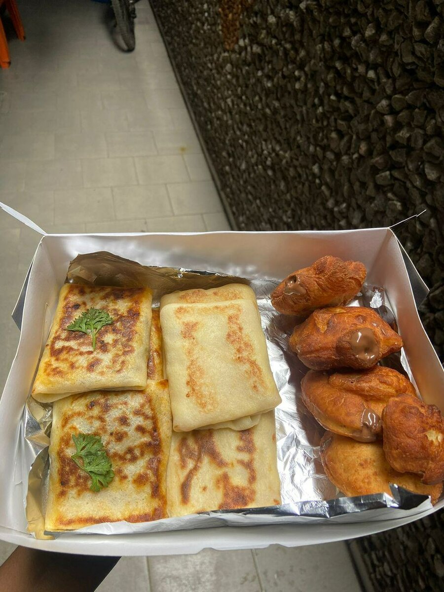 Savourez nos crêpes généreusement garnies (jambon-fromage, viande hachée, fromage) accompagnées de beignets au chocolat ultra moelleux.