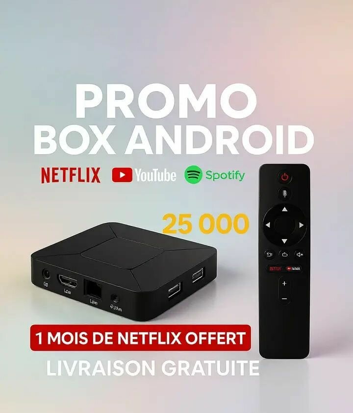 Découvrez la Box TV Android avec 1 mois de Netflix gratuit. Accédez à vos plateformes préférées comme YouTube et Spotify. Idéale pour transformer votre salon en centre multimédia. Livraison gratuite incluse !