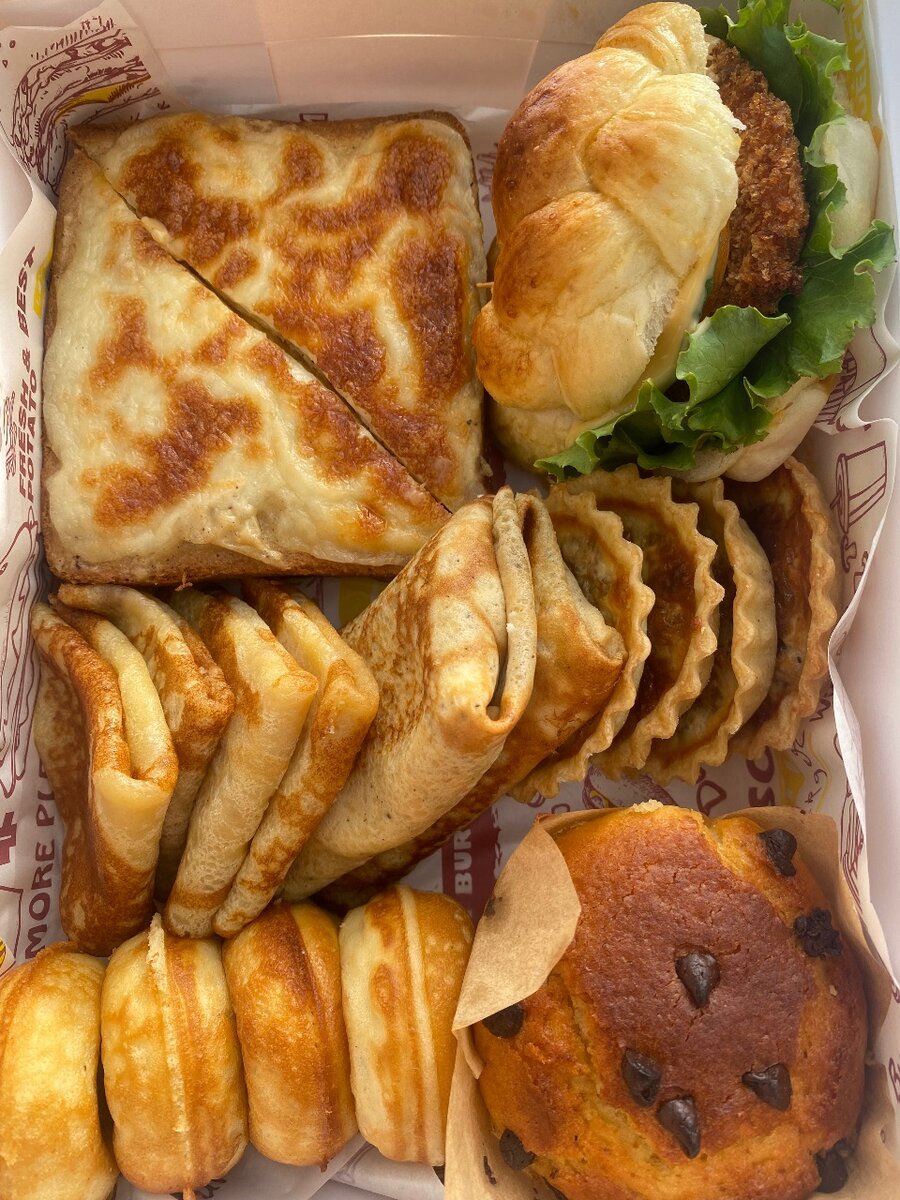 Un petit pack à partager seul ou en couple composé de quiche , de croque Monsieur, de sandwich pain brioché au poulet , de crêpes , de big muffins