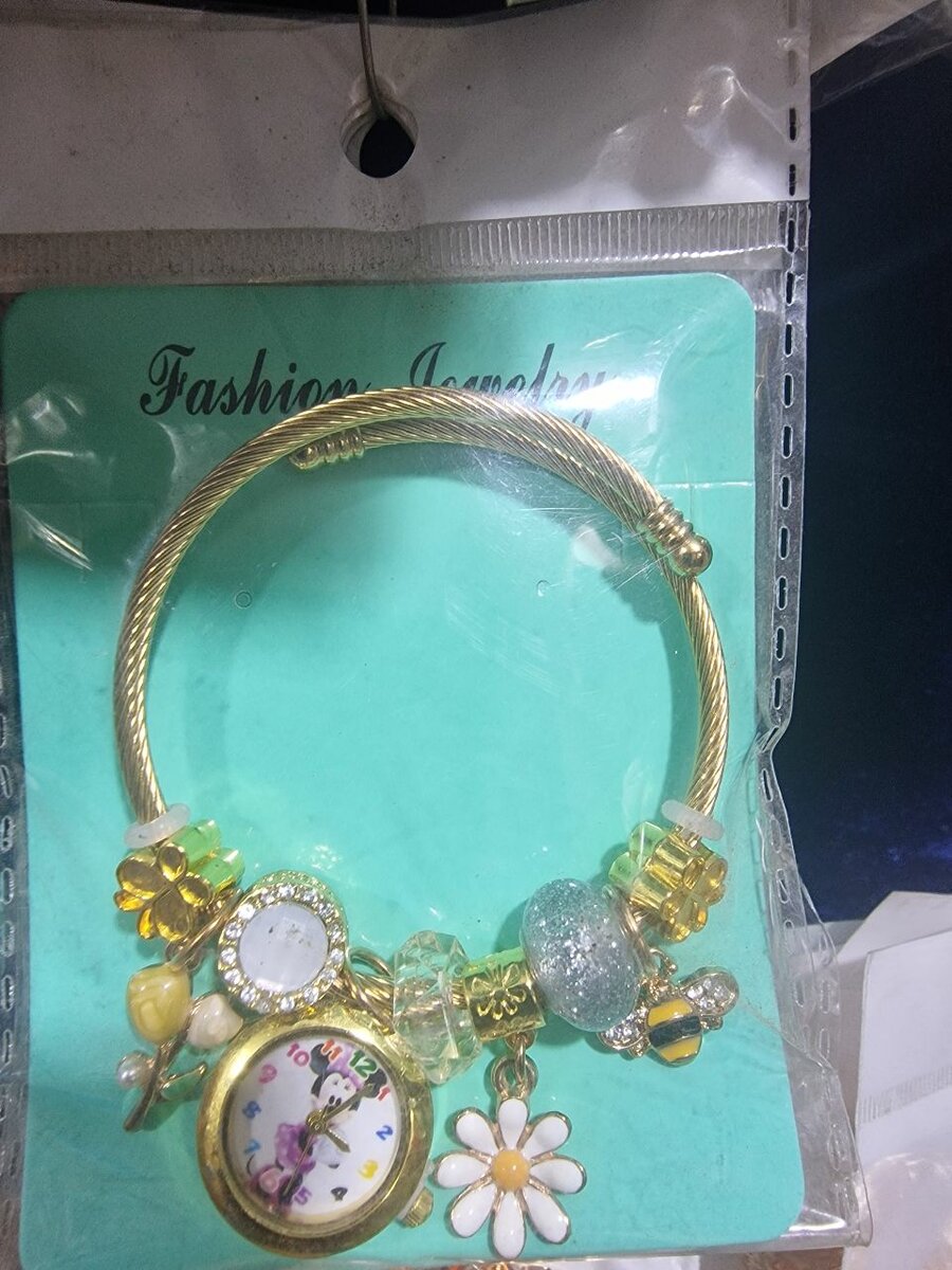 Découvrez ce bracelet élégant avec breloques charms colorées. Parfait pour ajouter une touche de glamour à votre tenue quotidienne ou pour des occasions spéciales. Le design en or avec des détails floraux et une petite montre attire tous les regards. Idéal pour offrir en cadeau à vos proches ou pour vous faire plaisir. Faites-vous remarquer avec ce bijou unique et mode!