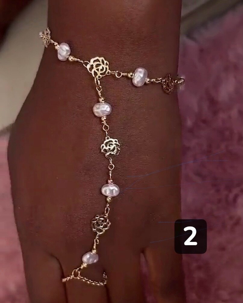 Élégant bracelet chaîne doré avec perles et motifs floraux, idéal pour événements spéciaux. Raffiné et féminin.