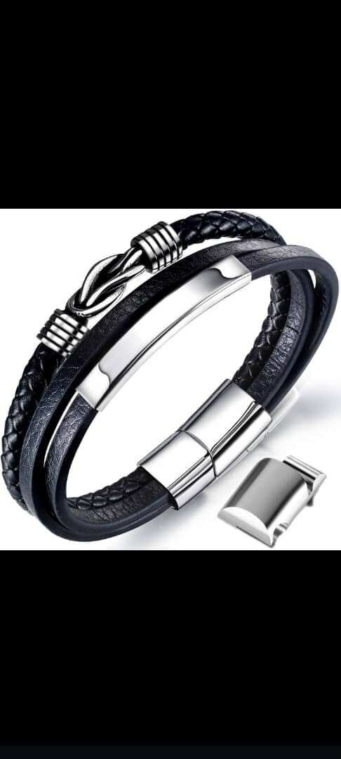 Élégant bracelet en cuir tressé noir avec fermoir en acier inoxydable. Parfait pour un style moderne et sophistiqué, adapté à toutes les occasions. Idéal comme cadeau.