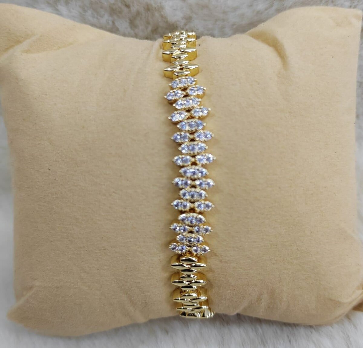 Découvrez ce bracelet doré éclatant, orné et brillantes pour une touche de glamour. Parfait pour rehausser vos tenues de soirée ou comme cadeau spécial. Conçu pour résister à l'usure tout en offrant un design sophistiqué. Idéal pour les occasions spéciales ou pour apporter un éclat quotidien à votre style.