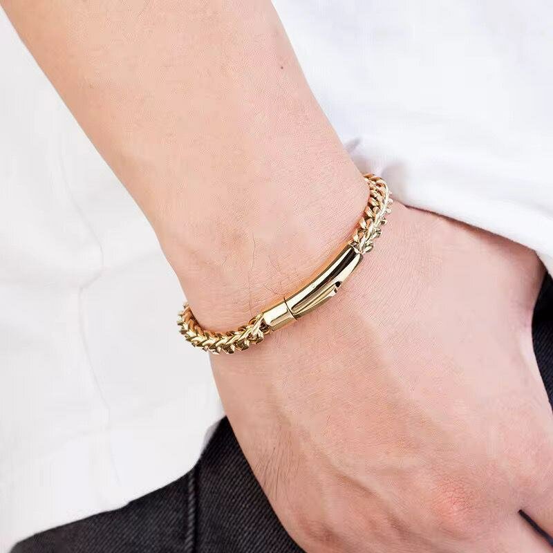 Ce bracelet en acier inoxydable doré est le choix parfait pour un style élégant et moderne. Fabriqué avec un design chaîne robuste, il ajoute une touche de sophistication à toute tenue. Idéal pour les occasions spéciales ou un usage quotidien, il est à la fois durable et tendance. Choisissez cet accessoire pour compléter votre look avec éclat.