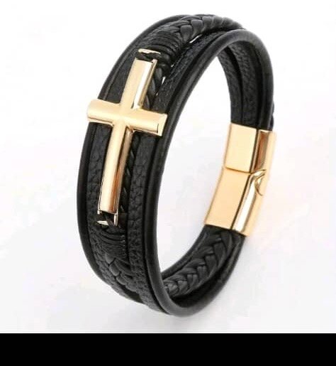Un bracelet élégant en cuir noir tressé avec une croix en métal doré, idéal pour les hommes qui aiment les accessoires robustes et élégants. Conçu pour un confort optimal et une durabilité exceptionnelle.