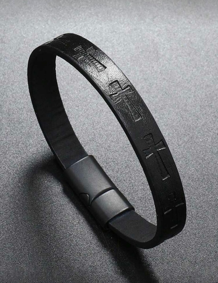 Bracelet tendance en cuir noir avec fermeture magnétique. Conçu pour les hommes, il arbore des motifs gravés pour un style unique. Résistant et confortable, il est idéal pour un usage quotidien.