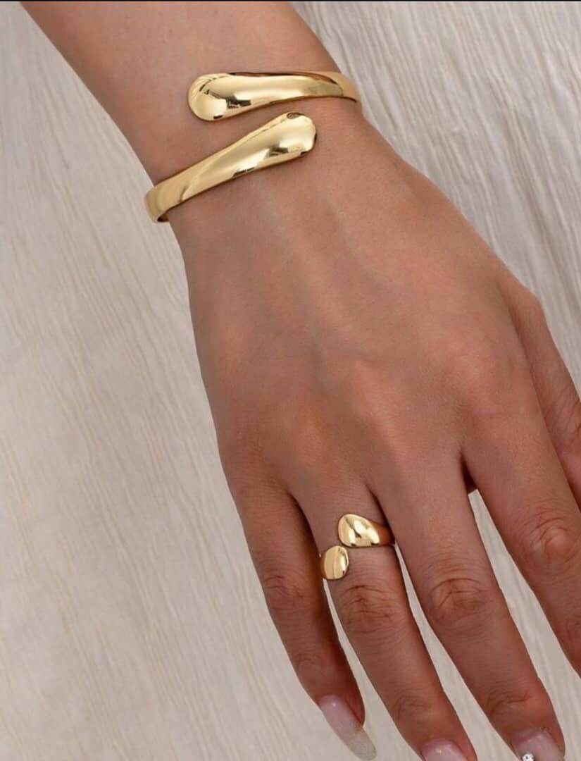 Adoptez le style avec cet ensemble bracelet et bague en or, au design moderne et luxueux. Parfait pour sublimer vos tenues de soirée ou ajouter une touche d'élégance au quotidien. Fabriqué avec des matériaux de haute qualité pour une durabilité exceptionnelle. Idéal pour offrir ou se faire plaisir.