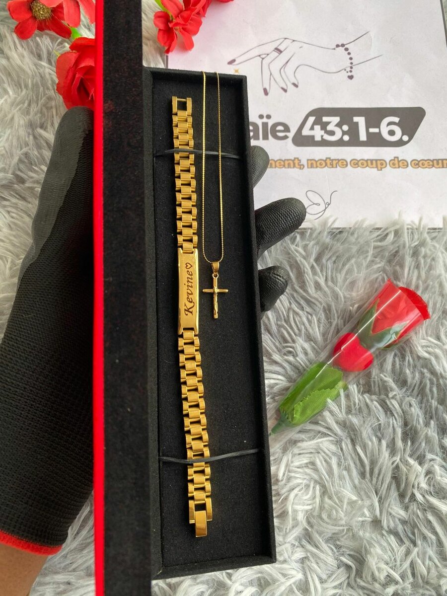 Élégant ensemble de bijouterie dorée comprenant un bracelet et un collier avec pendentif croix. Ce set est idéal pour toute occasion spéciale ou pour ajouter une touche de sophistication au quotidien. Parfait comme cadeau ou pour soi-même.