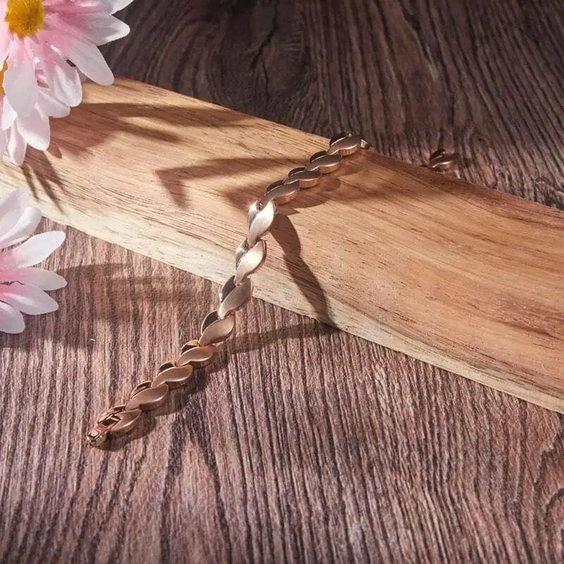 Découvrez ce bracelet magnétique élégant en or rose, idéal pour ajouter une touche sophistiquée à vos tenues. Conçu avec des maillons stylisés, il est parfait pour toute occasion. Profitez de ses bienfaits thérapeutiques tout en restant fashion.
