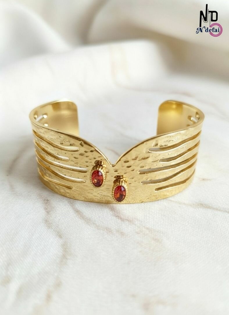 Raffiné bracelet manchette doré avec détails gravés. Idéal pour sublimer vos tenues de soirée. Design unique avec des ornements rouges pour une touche élégante.