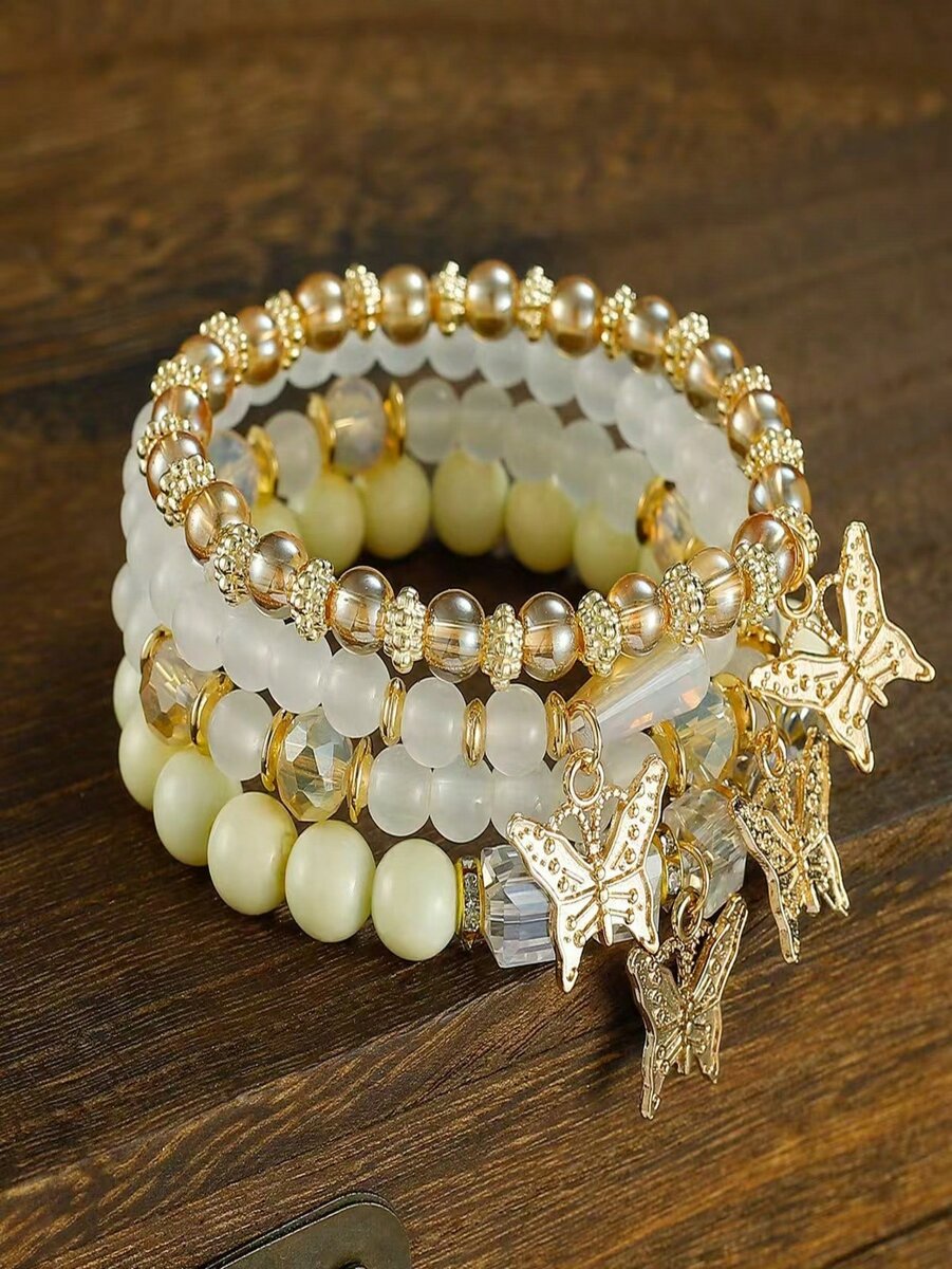 Ensemble de bracelets perlés élégants avec pendentifs papillon dorés. Idéal pour ajouter une touche glamour à vos tenues. Parfait pour un usage quotidien ou des occasions spéciales. Un accessoire incontournable pour toute garde-robe moderne.