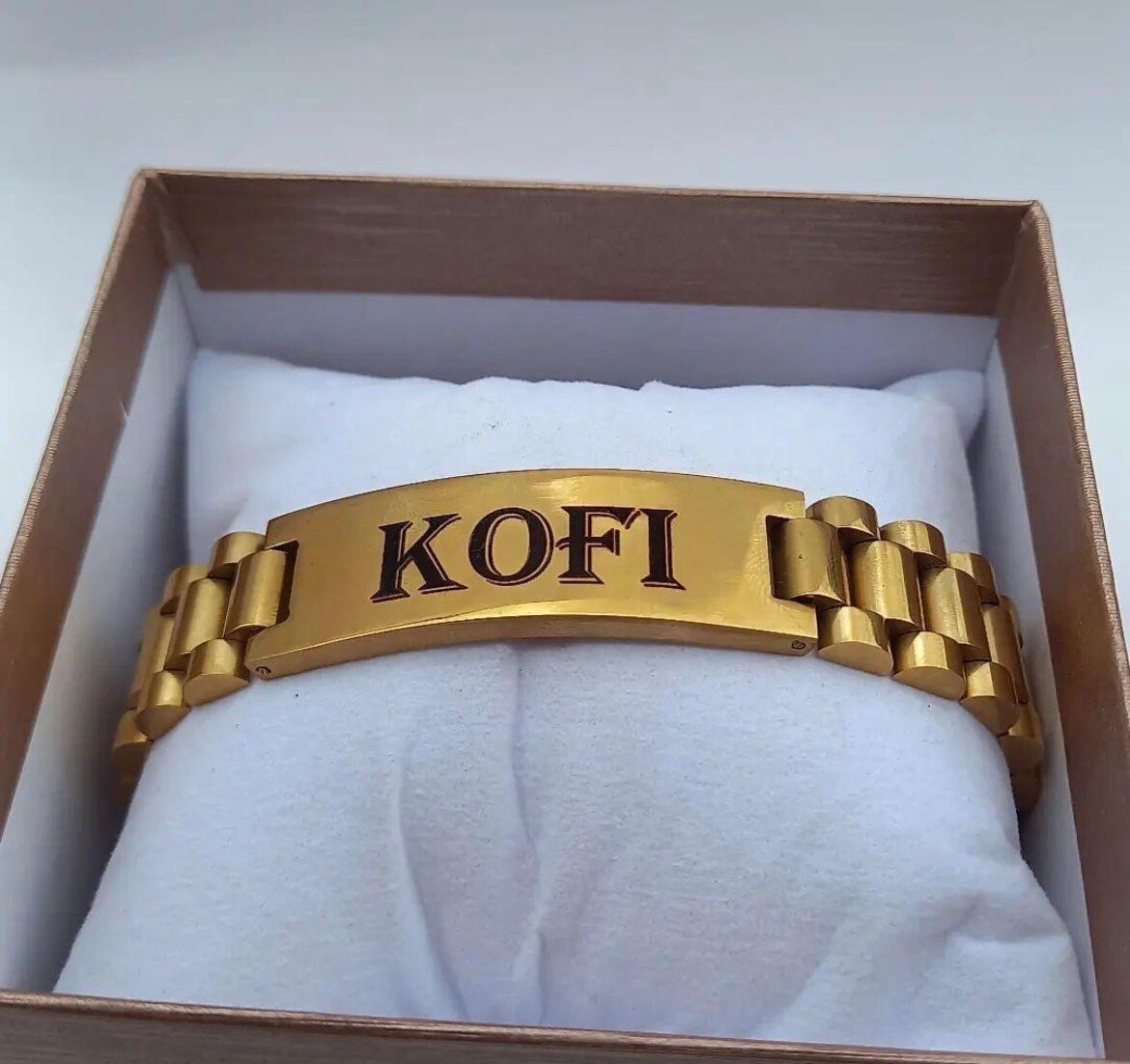 Découvrez ce magnifique bracelet personnalisé KOFI en métal doré. Un accessoire unique et élégant pour les hommes qui cherchent à se démarquer. Parfait pour un cadeau ou pour soi-même.