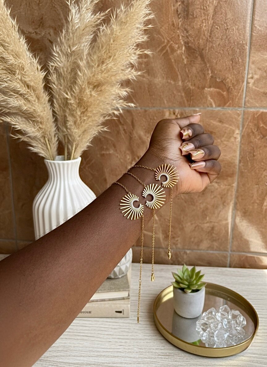 Ce bracelet doré fin , inspiré du soleil, ajoute une touche de sophistication à toute tenue. Parfait pour les événements spéciaux ou un usage quotidien, il offre un design unique qui attire l'œil. Conçu pour s'adapter confortablement à votre poignet, il est l'accessoire idéal pour illuminer votre look.