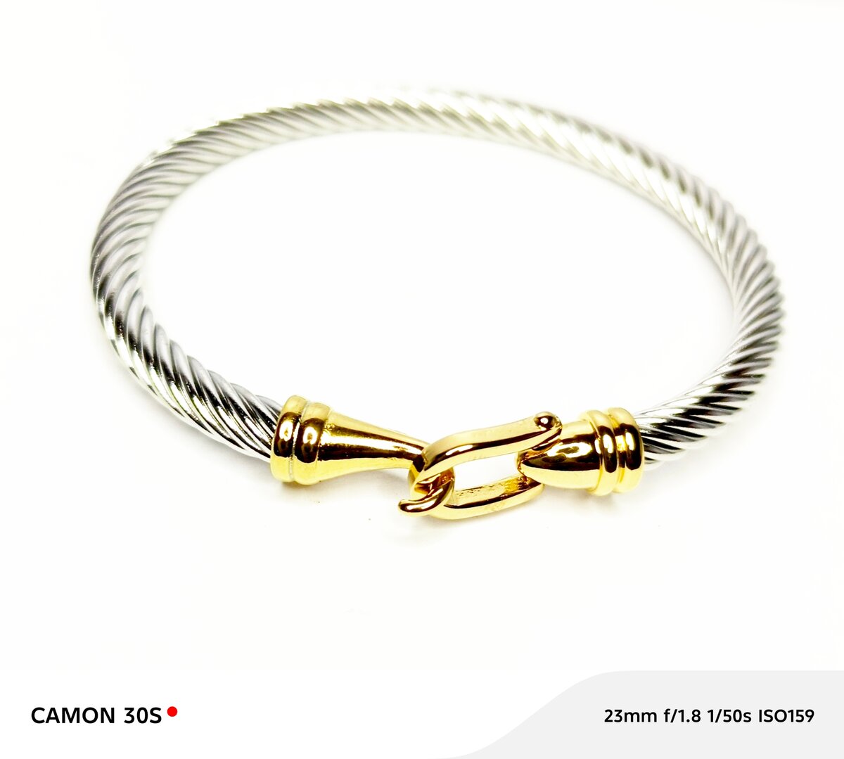 Ajoutez une touche de sophistication à votre tenue avec ce bracelet torsadé au design unique. Fabriqué avec une finition bicolore, il est parfait pour toutes les occasions. Léger et confortable, il complète élégamment votre style.