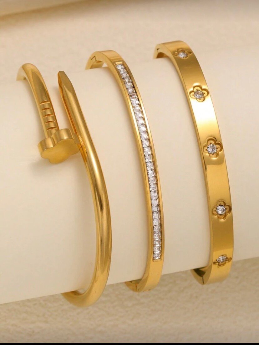 Découvrez ces bracelets dorés élégants et modernes, parfaits pour ajouter une touche de sophistication à toute tenue. Fabriqués avec soin, ces bracelets brillants offrent un design diversifié mélangeant clous et motifs brillants, idéal pour des occasions spéciales ou un usage quotidien chic. Très adaptable, cet ensemble de bijoux est un incontournable pour les amateurs de mode.