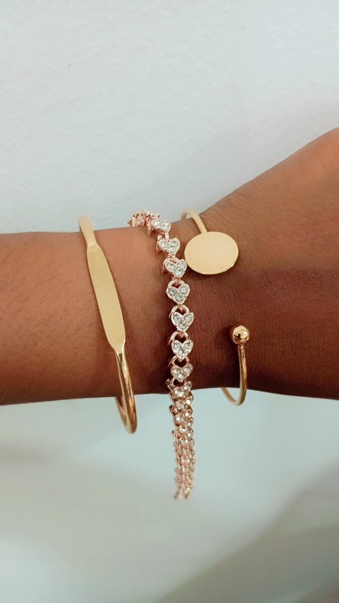 Découvrez notre ensemble de bracelets élégants pour femme, idéal pour sublimer votre style quotidien. Ce set comprend des bracelets dorés raffinés et un bracelet orné de pierres scintillantes en forme de cœurs, parfait pour ajouter une touche d'éclat à vos tenues. Fabriqués avec soin, ces bijoux s'adaptent à toutes vos occasions spéciales. Offrez ou faites-vous plaisir avec ce duo chic et intemporel.