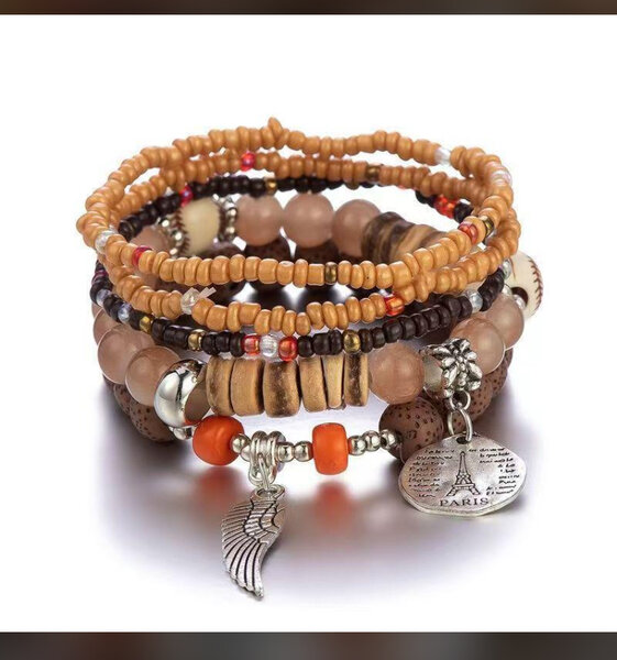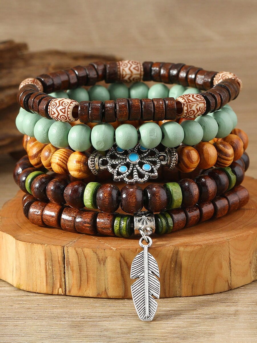 Ensemble de bracelets en bois bohème avec perles colorées et pendentif plume. Parfait pour ajouter une touche d'ethnique à votre look quotidien. Idéal pour les amateurs de mode décontractée.