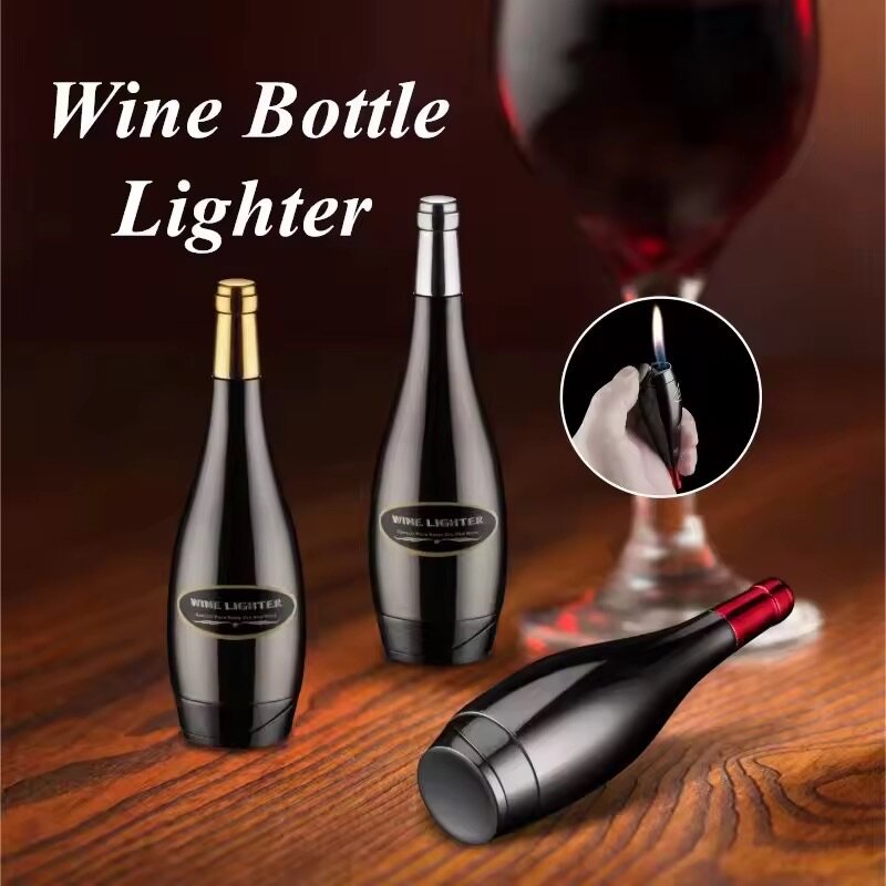 Briquet en forme de bouteille de vin, élégant et rechargeable au butane. Idéal pour les amateurs de design unique. Réglage facile de la flamme.