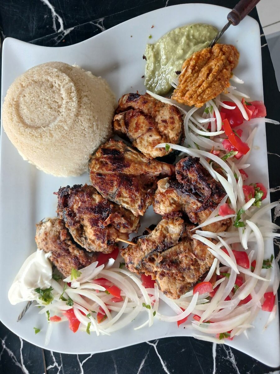 Savourez notre délicieux brochette de maquereaux, accompagné d'oignons frais, de tomates et d'attieké . Parfait pour une expérience culinaire authentique, ce plat est rehaussé par deux sauces savoureuses. Idéal pour un dîner gourmand entre amis ou en famille.