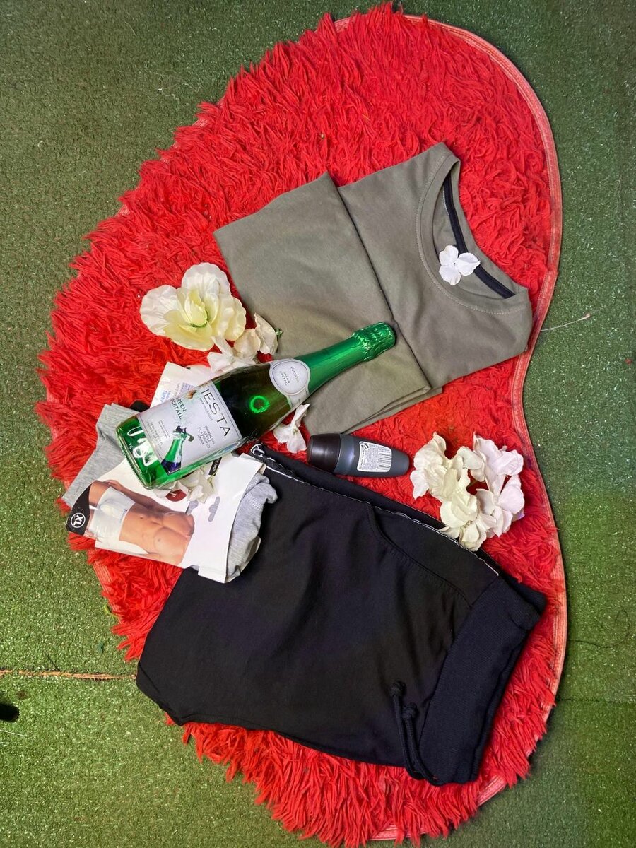 T shirt, shorts, a bottle of wine for Him