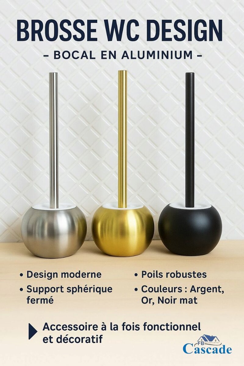 Élégante brosse WC avec support sphérique en aluminium, disponible en argent, or et noir mat. Combine fonctionnalité et style pour une salle de bain raffinée.