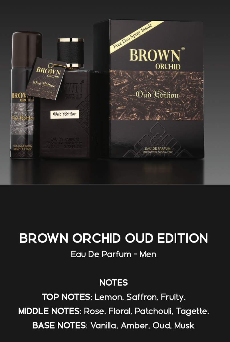 Découvrez Brown Orchid Oud Edition – un parfum captivant pour hommes. Avec des notes de tête de citron et safran, il s'ouvre sur une fraîcheur fruitée. Les notes de cœur de rose et patchouli ajoutent richesse et profondeur, tandis que les notes de fond de vanille et oud créent une élégance durable. Idéal pour une allure sophistiquée et magnétique, prêt à accompagner toutes vos occasions spéciales.