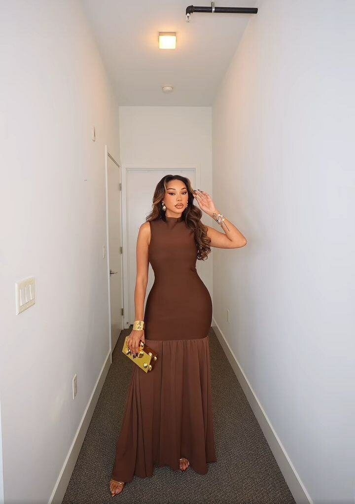 Elevate your style with this elegant brown sleeveless maxi dress, perfect for any occasion. Made to accentuate your figure, it's ideal for formal events or a night out.