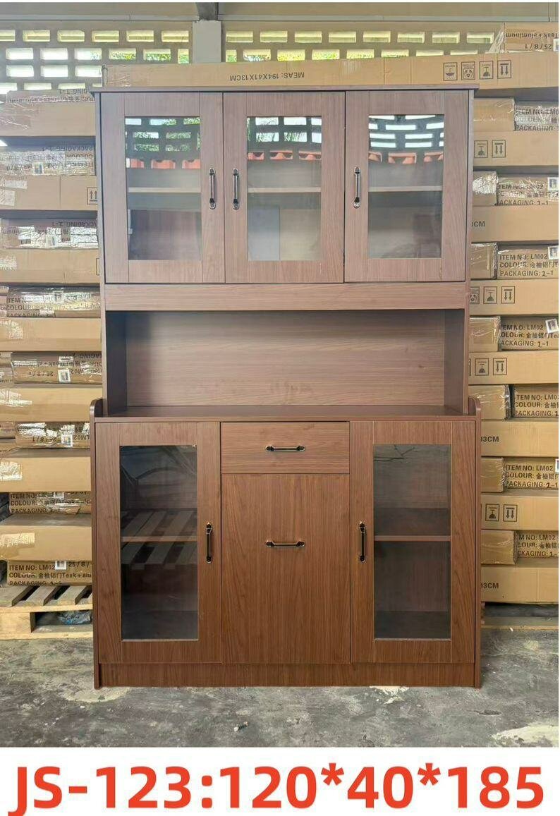 Élégant buffet en bois avec vitrines en verre. Idéal pour la cuisine ou la salle à manger. Offrant un espace de rangement spacieux avec étagères et tiroirs, parfait pour exposer votre vaisselle ou argenterie. Design moderne et fonctionnel, ce meuble est un ajout parfait à tout intérieur.