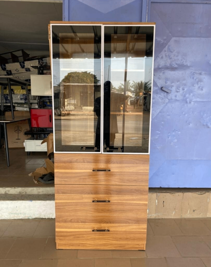 Optez pour ce buffet vitré en bois moderne, idéal pour ranger et exposer vos objets avec élégance. Ses étagères spacieuses et ses tiroirs offrent beaucoup d'espace de rangement. Parfait pour le salon ou la salle à manger.