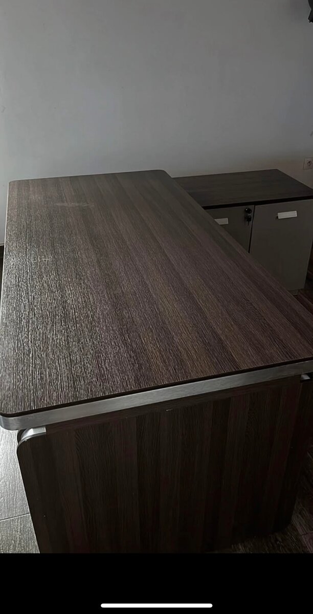 Importé des États-Unis ce bureau exécutif moderne en bois foncé gris, idéal pour un espace de travail professionnel. Dispose de tiroirs intégrés pour un rangement efficace.