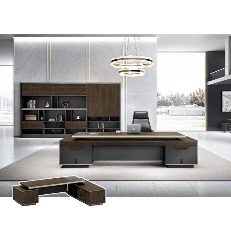 Bureau de direction en bois et métal, alliant élégance et fonctionnalité. Idéal pour les bureaux professionnels. Design contemporain avec espace de rangement intégré. Parfait pour une organisation optimale et une ambiance professionnelle.