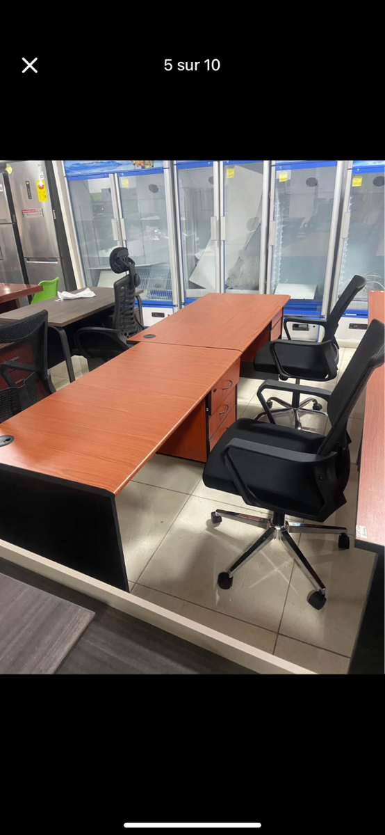 Bureau partagé en bois élégant avec deux chaises ergonomiques, idéal pour espaces collaboratifs ou bureaux à domicile. Offre confort et fonctionnalité.