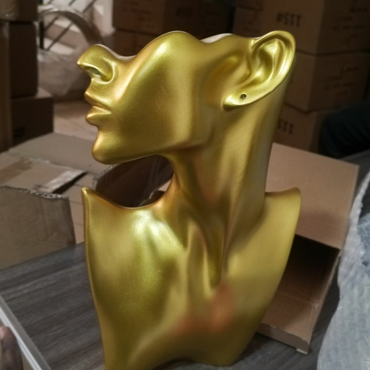 Ajoutez une touche d'élégance à vos présentations avec ce buste doré pour bijoux. Idéal pour mettre en valeur vos colliers et pendentifs, il apporte un look luxueux et moderne à votre vitrine. Parfait pour bijoutiers et boutiques.