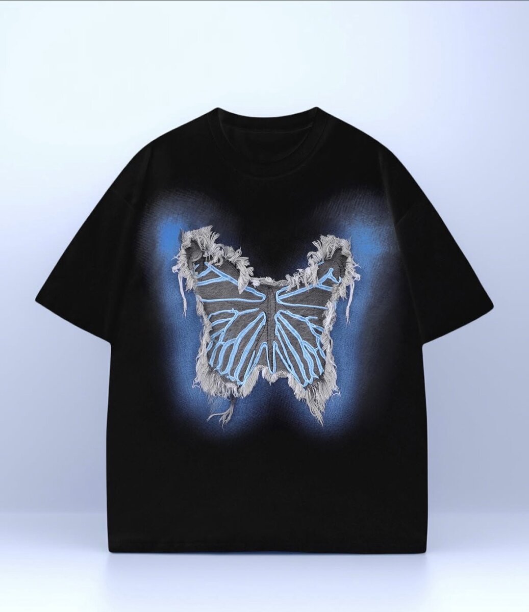 Libérez votre style avec ce t-shirt graphique papillon unique. Parfait pour des sorties décontractées ou pour faire une déclaration, il présente un design bleu et blanc frappant sur un fond noir classique. Fabriqué à partir d'un tissu confortable et de haute qualité, il assure un ajustement détendu pour un port toute la journée. Idéal pour les personnes avant-gardistes qui aiment se démarquer. Portez-le avec un jean ou un short pour un look tendance sans effort.