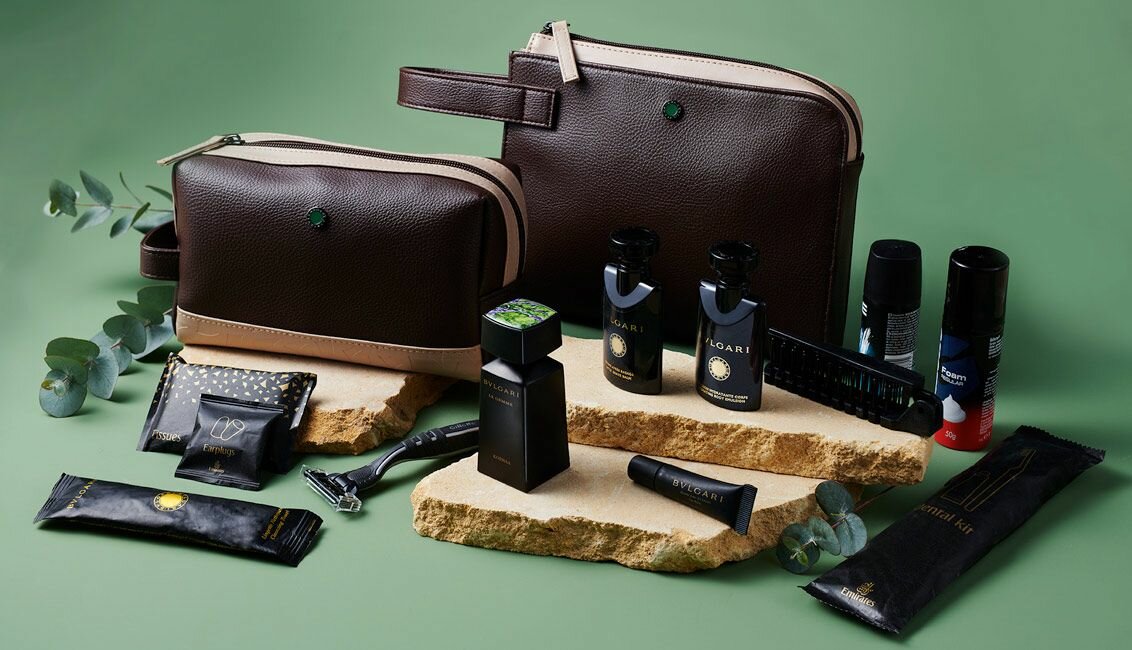 the scent is built around one of the most sacred raw materials - black incense. Developed by master perfumer Jacques Cavallier, it maintains the clean, fresh facets of white incense while adding powerful smoky notes. The kit also features other Bulgari products such as an aftershave balm, a body emulsion, a cleansing towel, and a lip balm, presented to customers into a Bulgari drawstring pouch. The kit also includes a Gillette razor, shaving foam, a dental kit, a deodorant, tissues, earplugs.