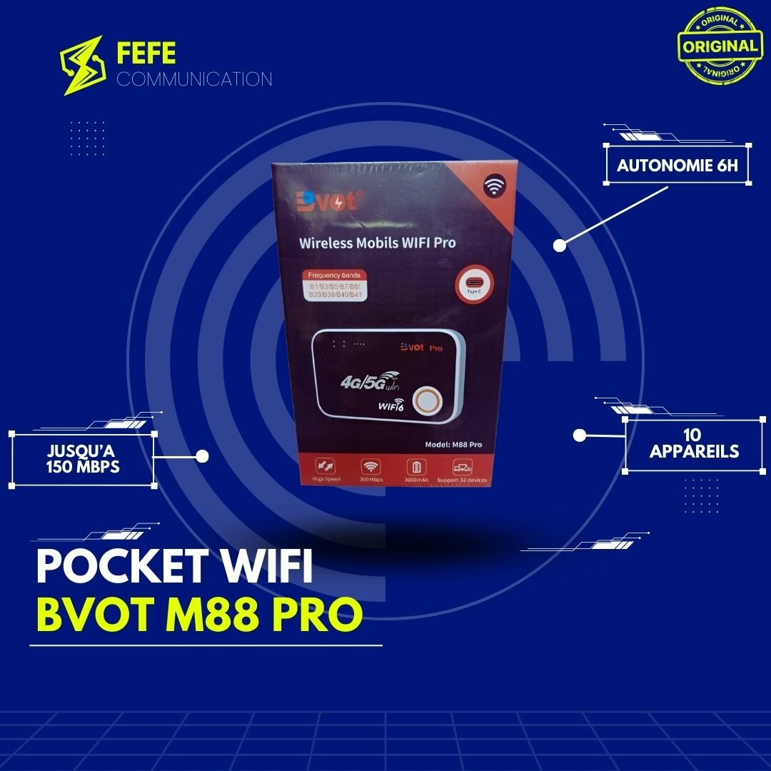 Bvot M88 Pro - Pocket WiFi Livraison Express avec reçu et garantie. Disponible Chez Fefe Communication Connexion 5G / 4G Autonomie : 6H Débit de la connexion jusqu'a 150Mbps 10 Appareils.