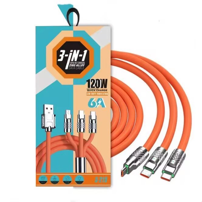 Câble puissante de charge rapide 3-en-1, compatible avec USB, Type-C et Micro USB. Parfait pour recharger différents appareils avec un seul câble. Robuste et durable, idéal pour la maison ou le bureau.