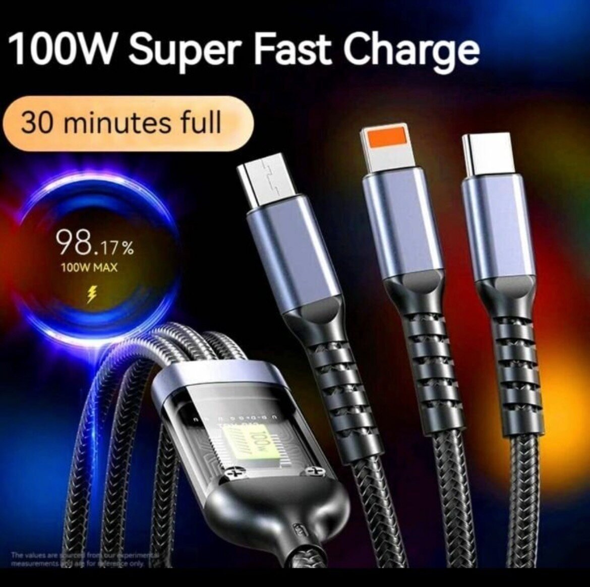 Câble de charge ultra rapide 100W avec connecteurs multiples pour un chargement rapide et efficace. Remplit à 98% en seulement 30 minutes. Idéal pour tous vos appareils.