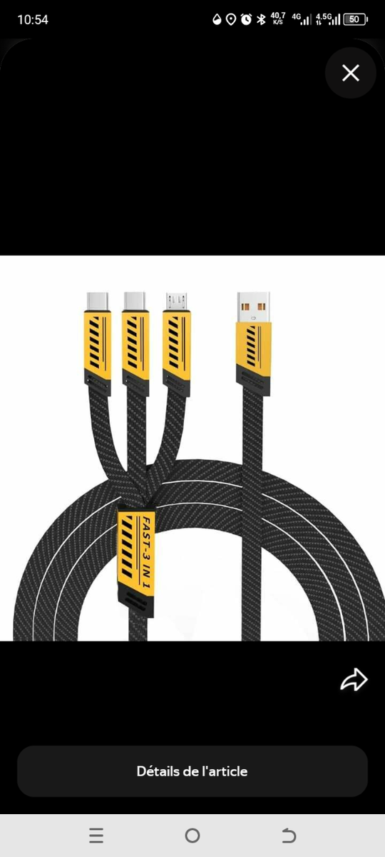 Optez pour ce câble de chargement rapide 3-en-1, compatible USB, Type-C et Micro USB. Idéal pour recharger vos appareils divers rapidement et efficacement. Résistant et flexible, ce câble est parfait pour un usage quotidien à la maison, au bureau ou en voyage. Un incontournable pour éviter l'encombrement des câbles multiples.