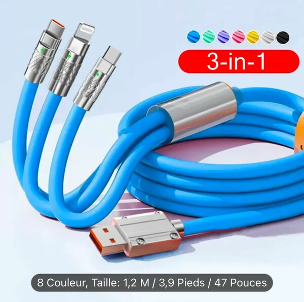 Câble de recharge 3 en 1 compatible Apple, Android et Type-C. Pratique et élégant en blanc pur, idéal pour les déplacements et la maison.