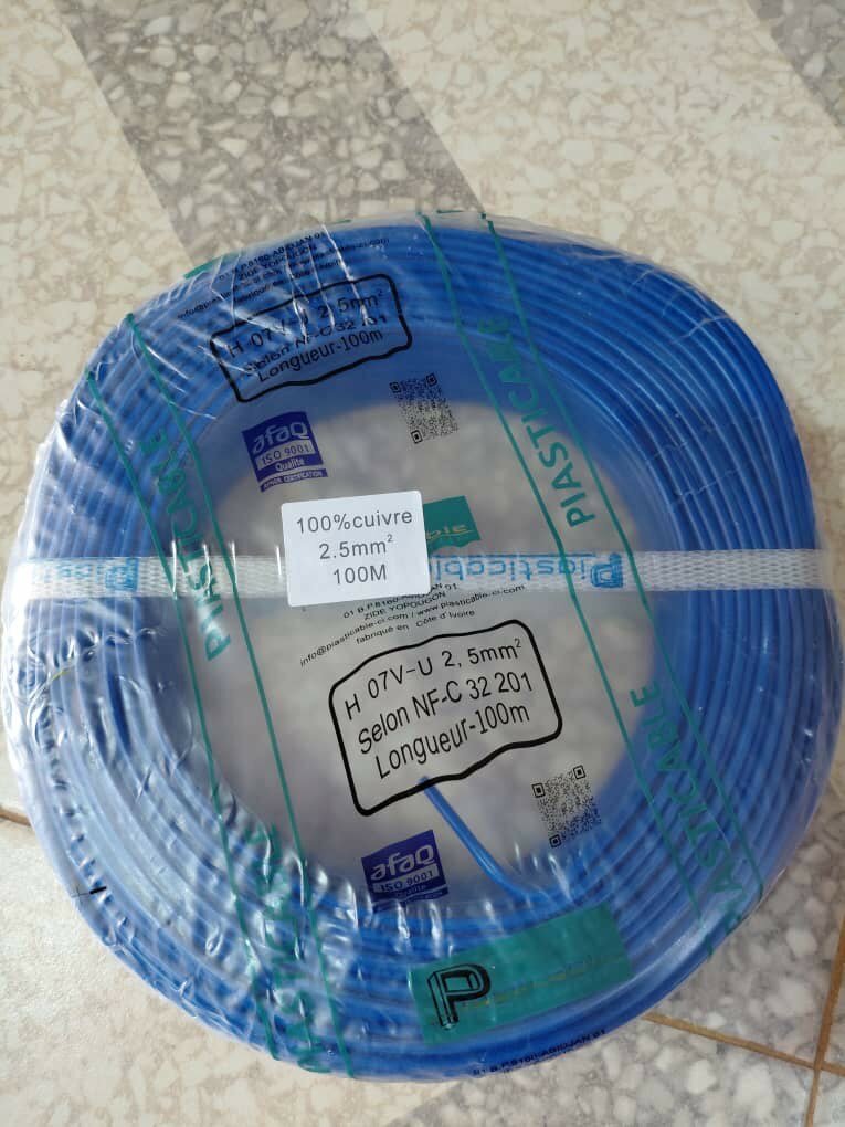 Câble électrique en cuivre 100%, section 2.5mm², idéal pour installations domestiques et industrielles. Longueur 100m, normes NFC 32-201. Qualité supérieure pour une connexion fiable et sécurisée dans vos projets électriques.
