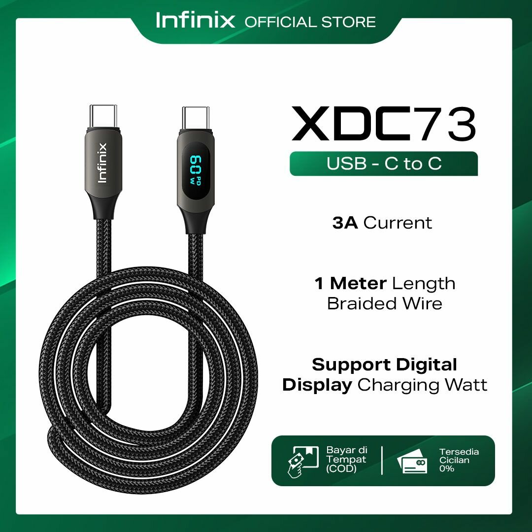 Profitez d'une charge rapide avec le câble Infinix XDC73. Ce câble USB-C à C de 1 mètre supporte 3A et affiche la puissance de charge en temps réel grâce à son écran numérique. Fabriqué avec une gaine tressée résistante, il assure durabilité et performance pour vos appareils.