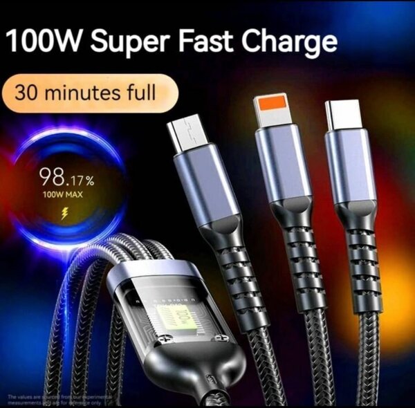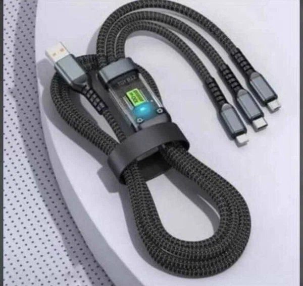 Chargez plusieurs appareils simultanément avec ce câble USB 3-en-1 robuste et efficace. Parfait pour la maison, le bureau ou les voyages, compatibilité universelle avec un affichage numérique pour suivre la charge.